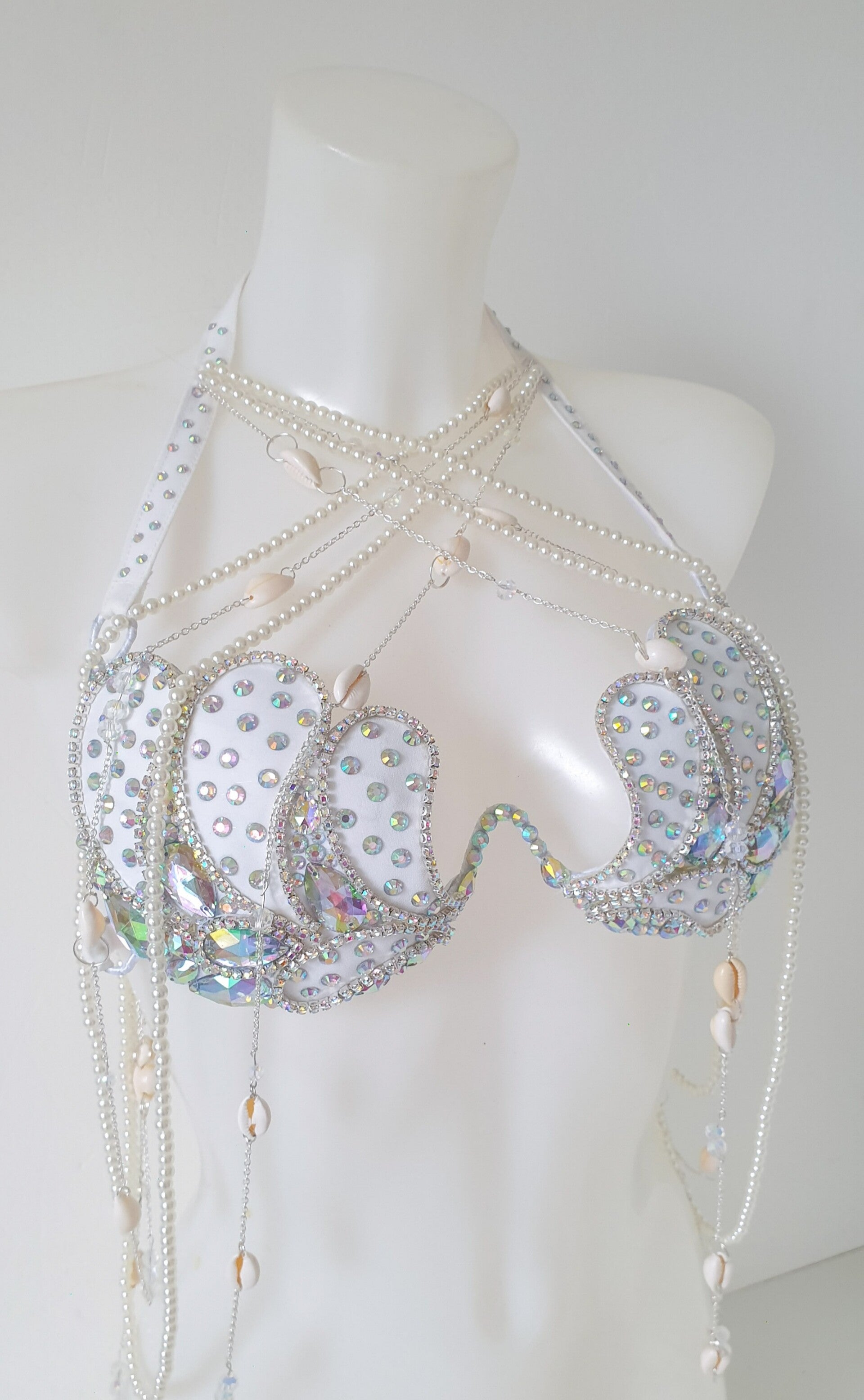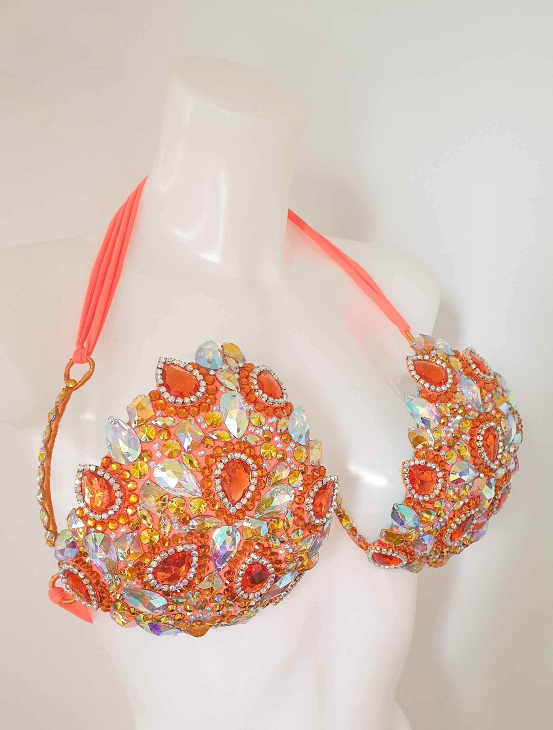 We make wire bras for all sizes (cup A to cup H), fully covered ones and more skimpy ones. They are also made of a bendable wire, just like all the headpieces. Every bra gives enough support and lift to the breasts and is easy to put on. Wire bra's can be worn with samba costumes but they also look great on skirts, bodysuits, shorts and high waist pants or bottoms.