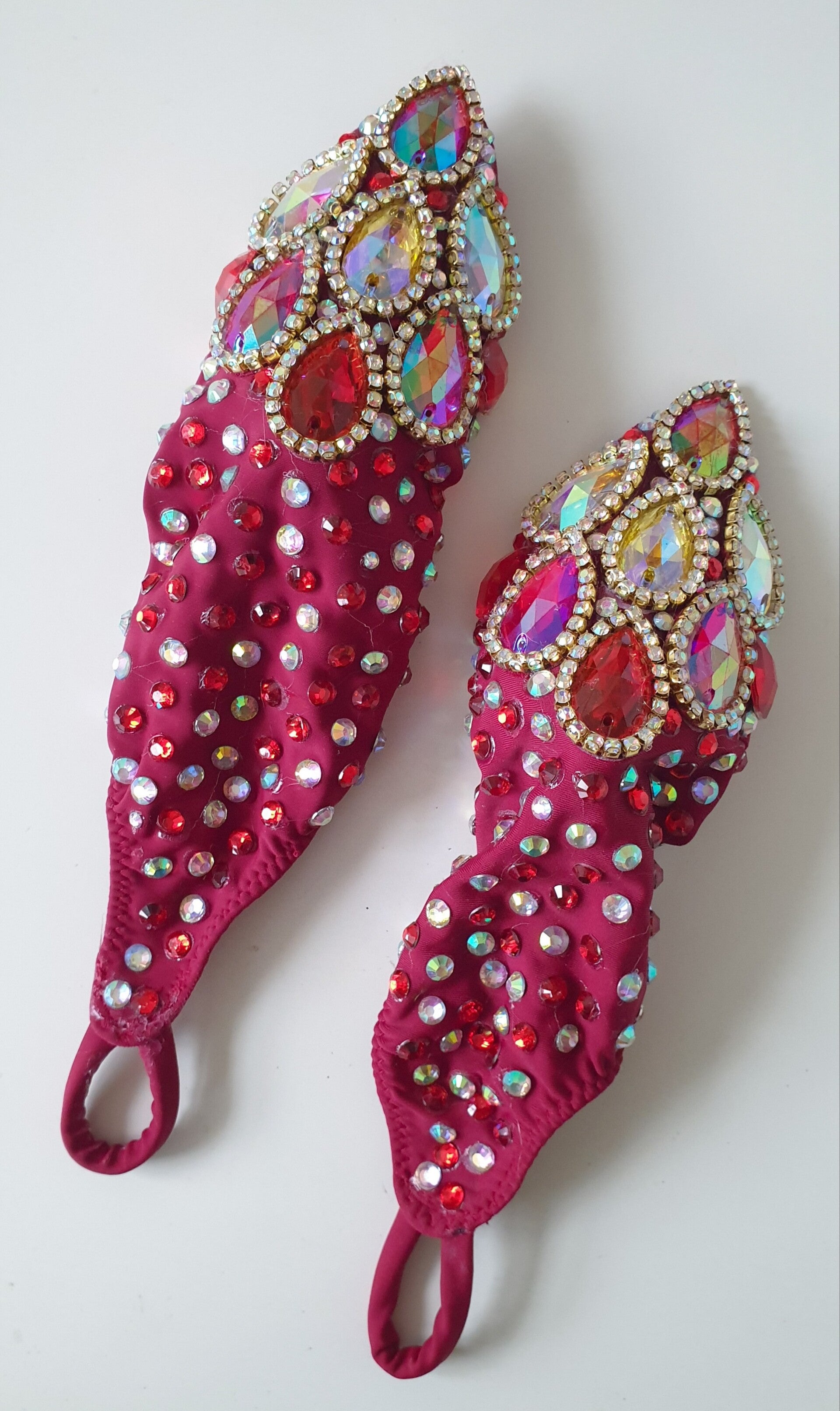 The items that gets ordered from us the most most are bodysuits. Bodysuits look great on every body type and are mostly very comfortable to wear. They are also way easier and quicker to put on than most two piece sets or other samba costumes. We offer different types of bodysuits, it really depends on the client's wishes and body type to see which style suits the best. There are covered up bodysuits, bodysuits with a cut out in the chest area (that is if you want to wear it with a wire bra), there are bodysuits with pieces of mesh, some bodysuits have fringe or chains or beads.